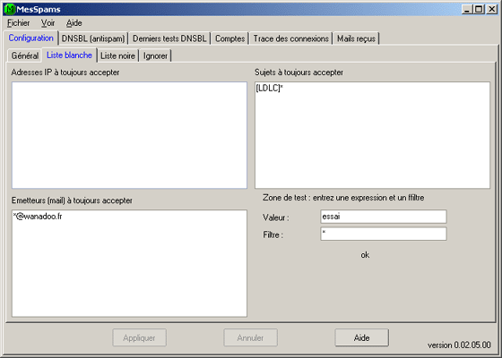 - Sujets à toujours accepter : liste des sujets qu'il faut toujours accepter. Par exemple : "[LDLC]*" demande de toujours accepter les messages dont le sujet commance par [LDLC] (correspondant a une liste de diffusion de l'entreprise LDLC)
